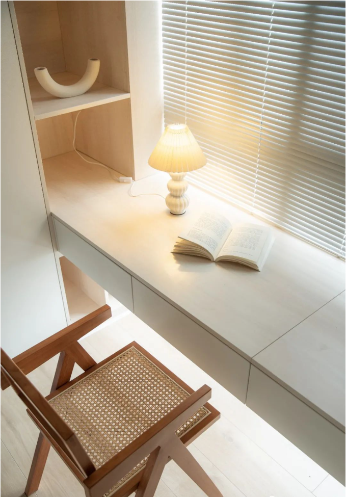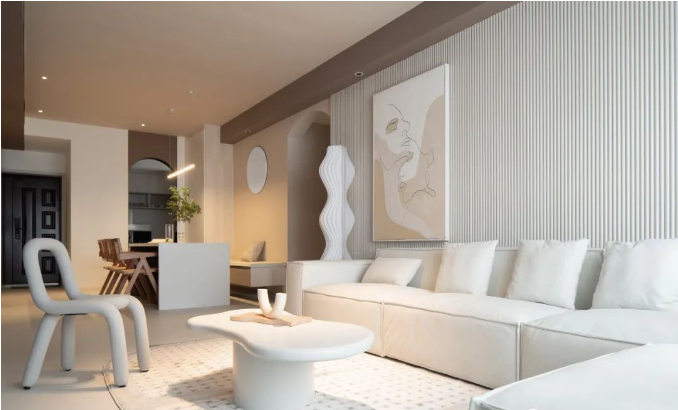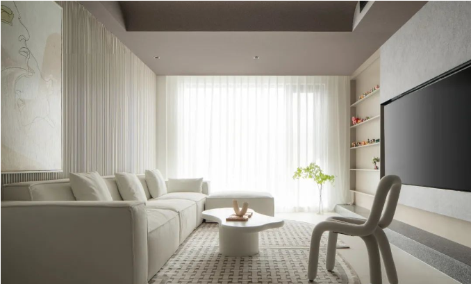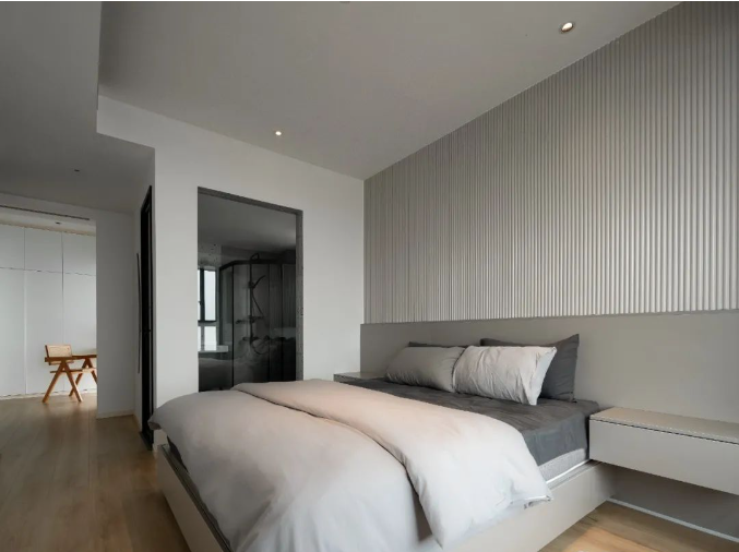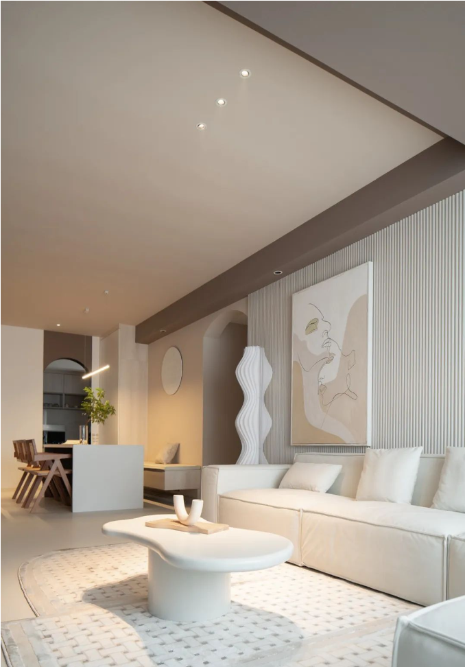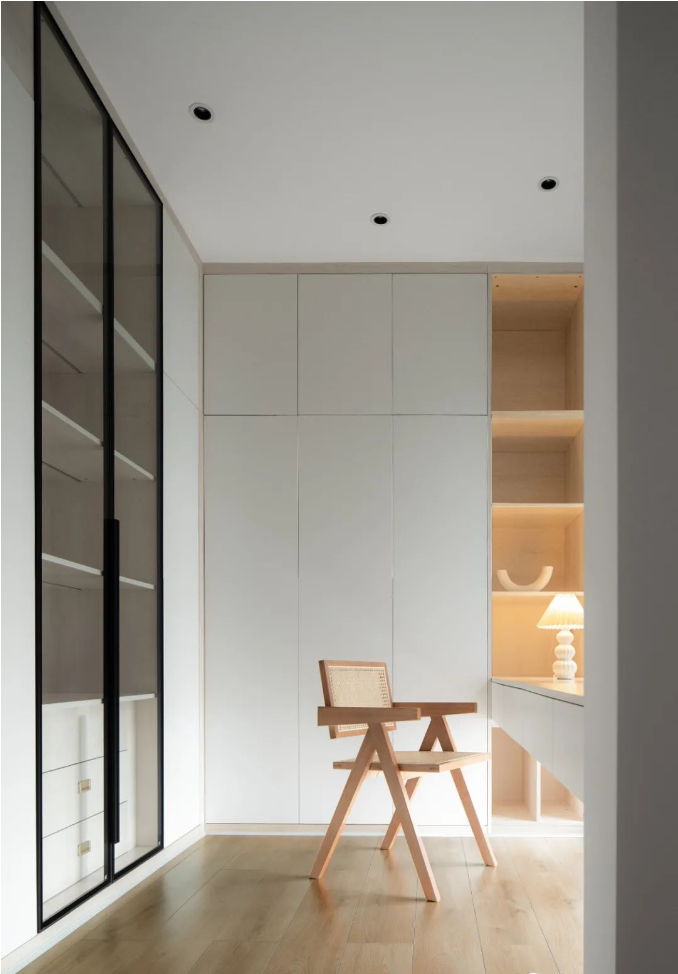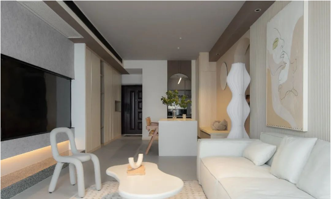 設計理念:本案是一套面積為102平米的三屋室,屋主是一對年輕夫妻,要求三房改兩房,有獨立衣帽間,盡可能多的收納空間。空間調(diào)性要時尚,簡約,高顏值。自貢名筑設計師通過結構改造、色彩、燈光、軟裝搭配呈現(xiàn)出奶油色系的溫柔空間。