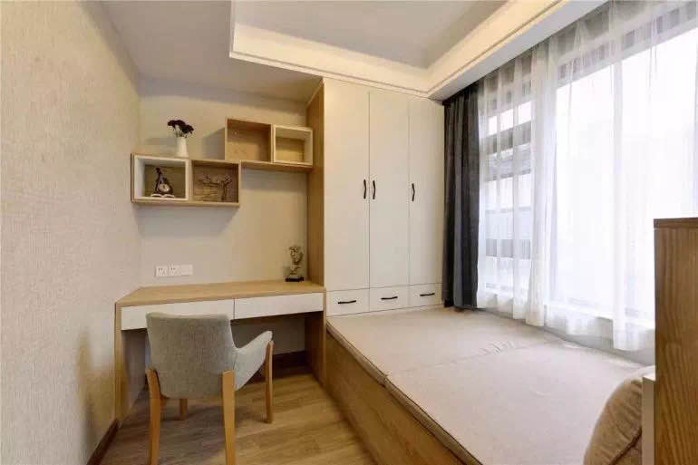 一些房間特別小的臥室,塞進一張床后,基本就沒啥空間了。改造成榻榻米+衣柜的簡單造型,不僅將墻面等空間都利用起來,反而無形中擴大了臥室面積,還能擠出一個小書房。