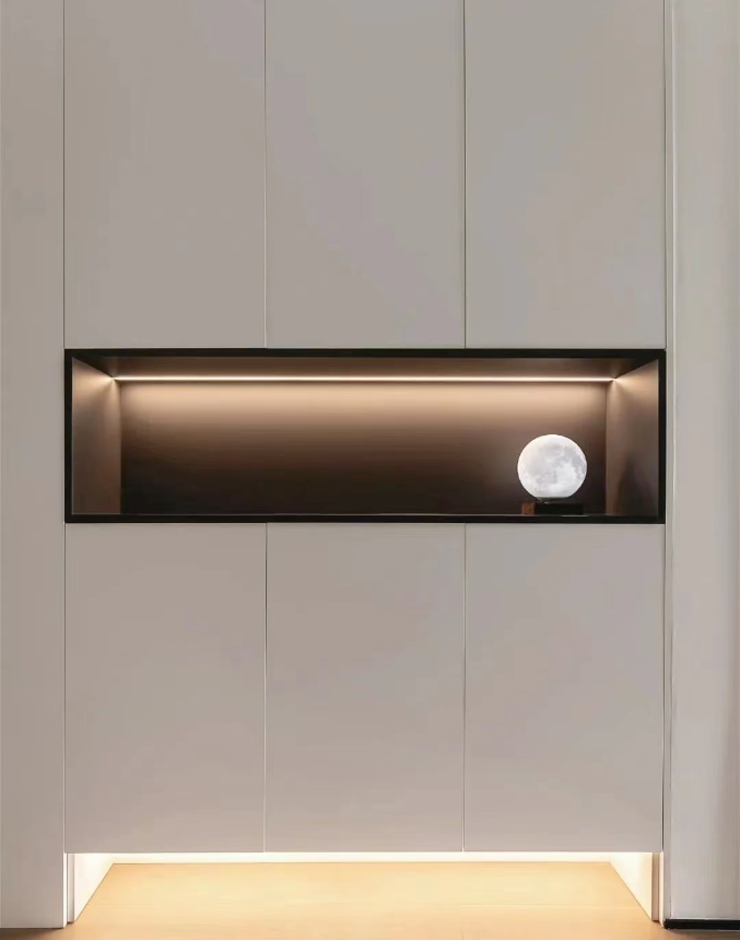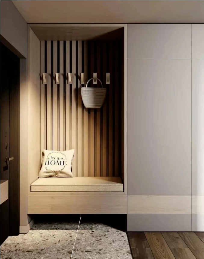 我們的入戶空間如果是做定制玄關(guān)柜,別忘了在底部預(yù)留10cm-30cm的懸空空間。這樣設(shè)計方便進(jìn)出時放置一些常用的鞋子,節(jié)省時間還能讓空間更整潔。