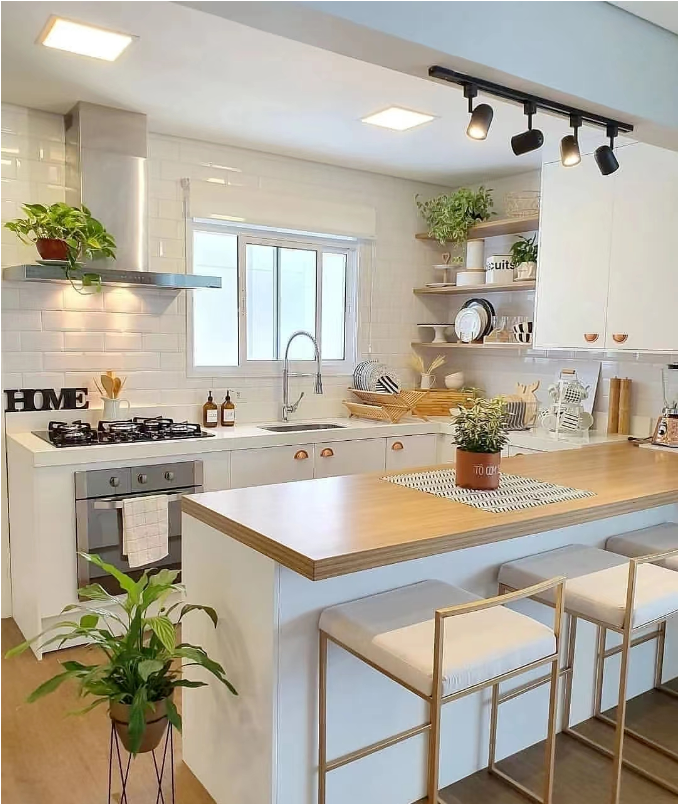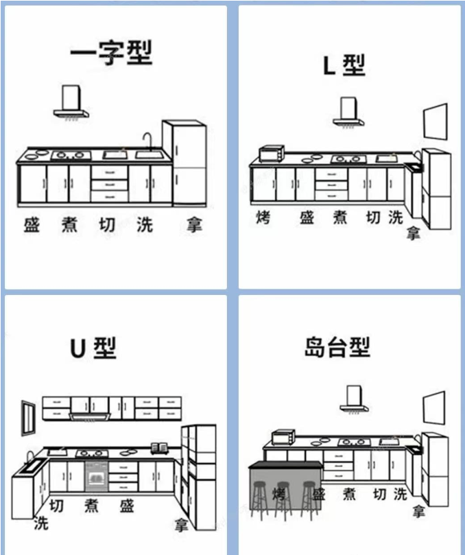 考慮到面積問題,廚房的布局還分為4種,一字型、L型、U型、島臺布局