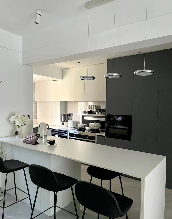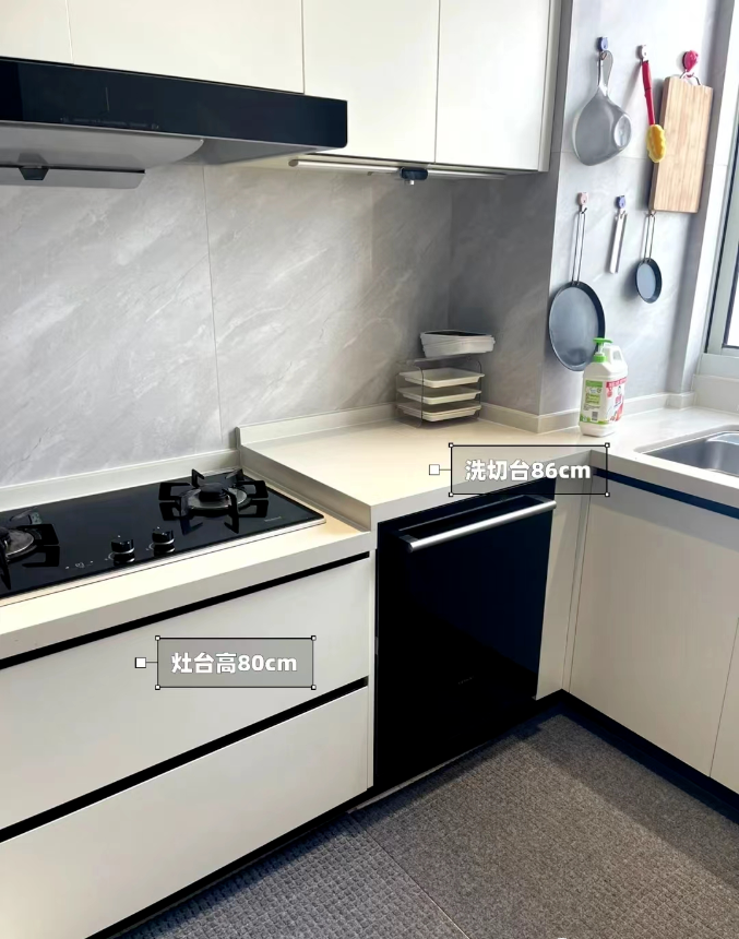 此外,廚房還可以根據(jù)需要設(shè)計高低臺。常規(guī)灶臺高度在70cm-80cm,或者按照做飯人的身高/2+10CM。水槽高度在80cm-90cm,兩個區(qū)域最好保留10cm的高度差,日常使用會更舒適。