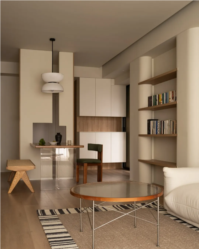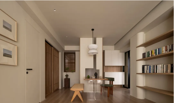 一間臥室,改變動(dòng)線后,設(shè)計(jì)為集辦公、儲(chǔ)物、閱讀、茶室、臨時(shí)客房一體的多功能空間。