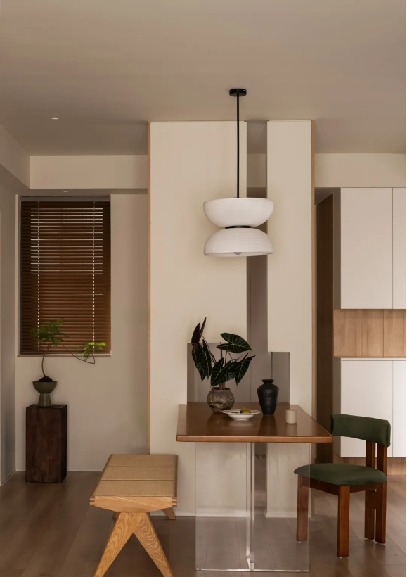 入戶以回歸自然為主旨,將傳統(tǒng)的可觀游園林設(shè)計(jì)手法帶入,餐桌的正中位置為點(diǎn),新建墻體,將玄關(guān)獨(dú)立。