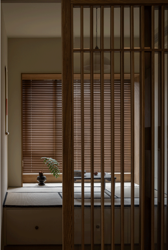 木柵推拉門(mén)可開(kāi)可合,內(nèi)外功能隨之互聯(lián),開(kāi)闊透亮之余,最大化放大空間視覺(jué)。