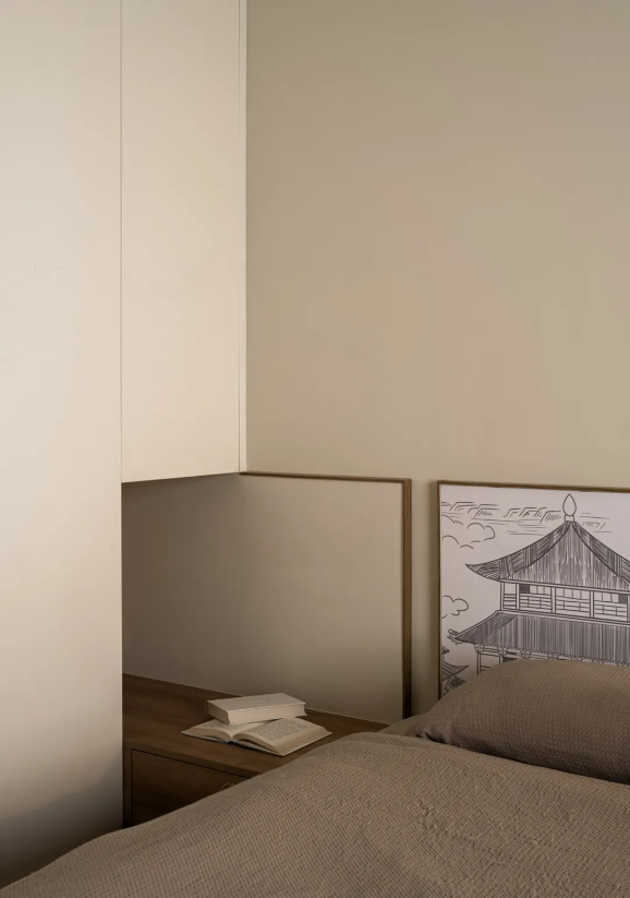 臥室延續(xù)外部素雅色調(diào),局部融入飽含東方美學(xué)意境的墻頭插畫(huà),給予足夠優(yōu)雅、舒適的睡眠氛圍。