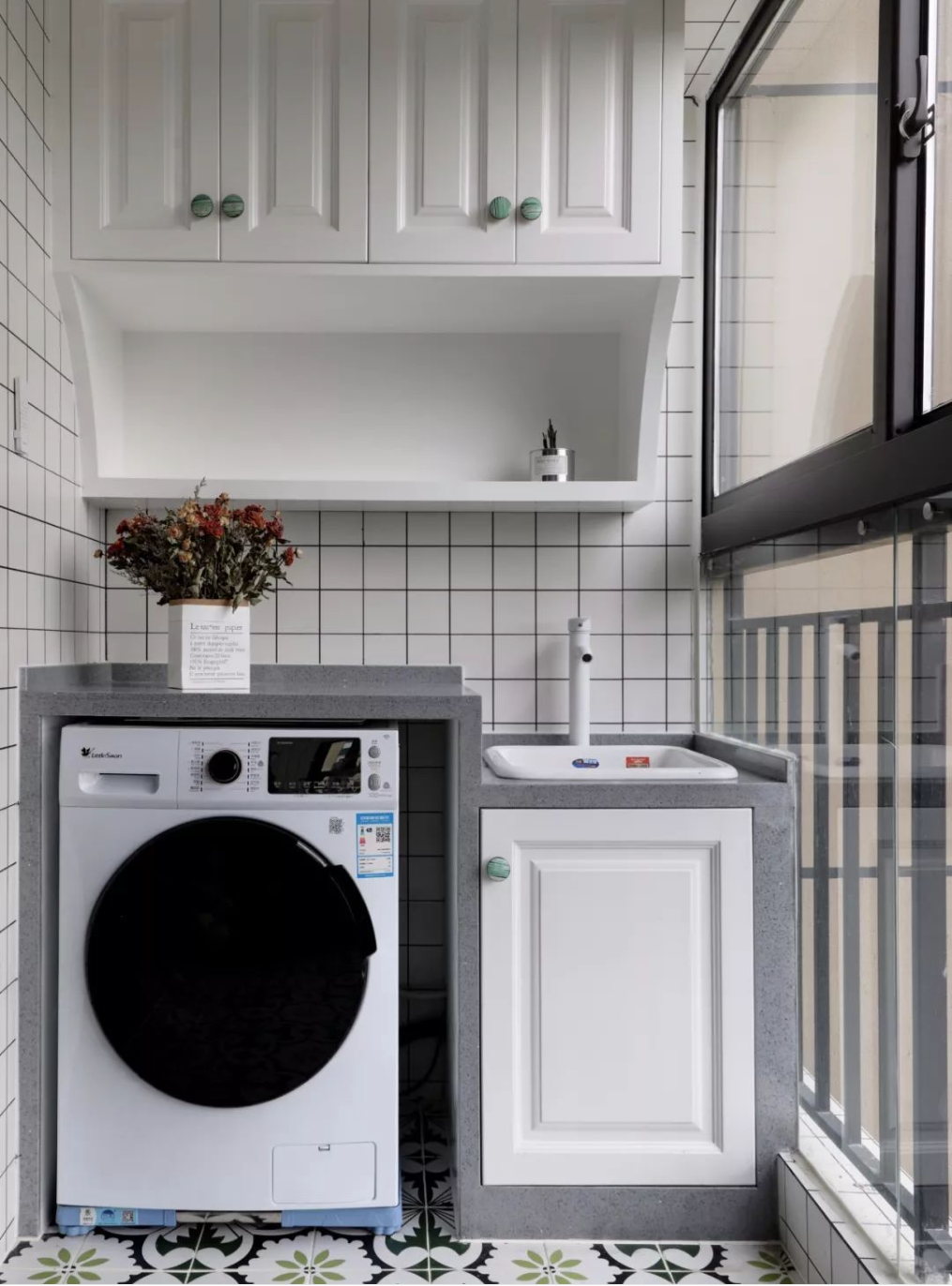 考慮嵌入式設(shè)計(jì):若計(jì)劃安裝嵌入式洗衣機(jī),需在裝修前提前預(yù)留好足夠的空間并確認(rèn)洗衣機(jī)型號(hào)與尺寸。確保洗衣機(jī)能夠順利嵌入陽臺(tái)柜中,既美觀又節(jié)省空間。